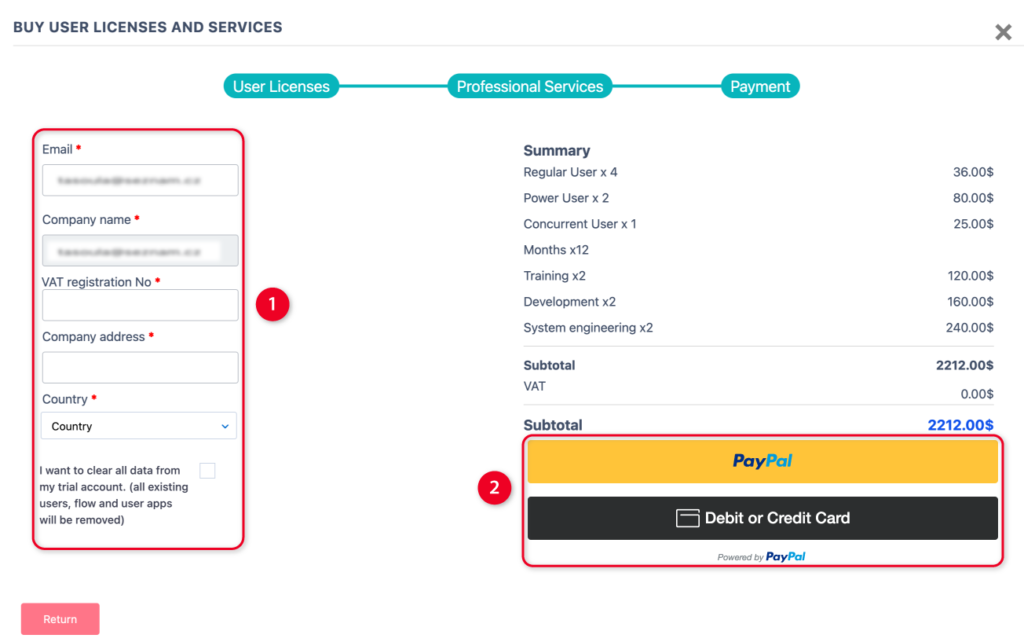 - Move to the Payment step. Fill in your personal and business details on the left, including email, VAT number, and company address, and select your country. The company name is pre-filled based on the details you added during the trial registration. If you want to clear all data from the trial account(pre-existing data, as well as the data you have entered), check the checkbox. Once details are added, view the total summary on the right side. Choose “PayPal” to pay through your PayPal account or click “Debit or Credit Card” to pay using card information. Note that that we use PayPal also for credit card payments, which means we do not keep or use in any way your card information.