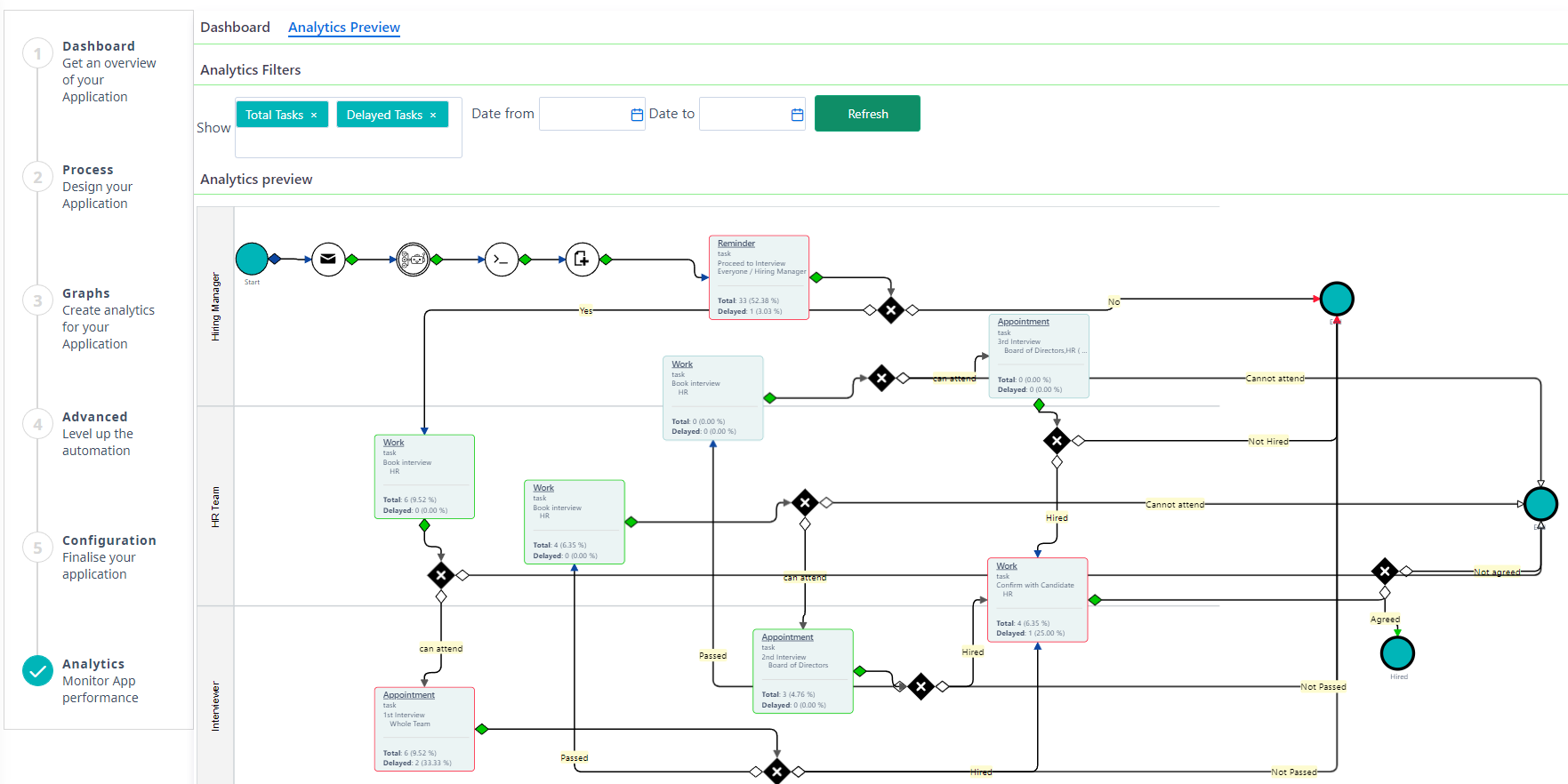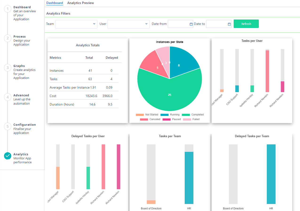 - Click on Refresh and the following graphs are populated: Analytics Totals, Instances per State, Tasks per User, Delayed tasks per User, Tasks per Team, Delayed tasks per Team