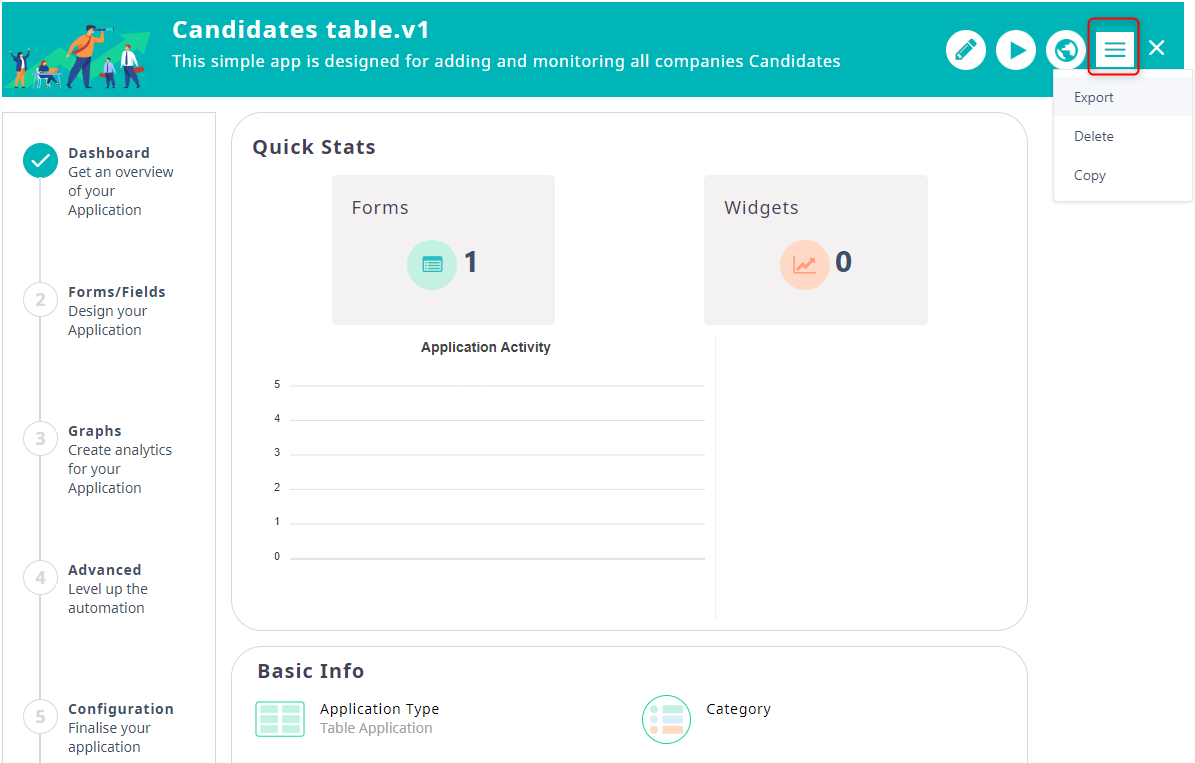 - Click on the Actions button and choose Export if you want to export the current application.