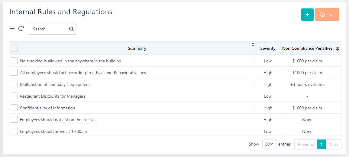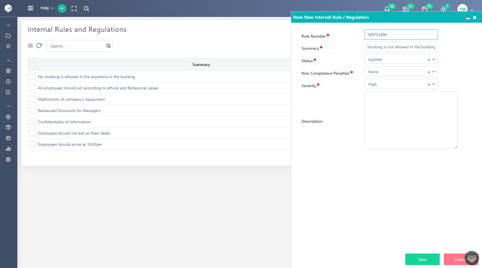 - A drop-down list field that would indicate the penalties that employees are going to face in case they are not compliant with the internal rules and regulations.