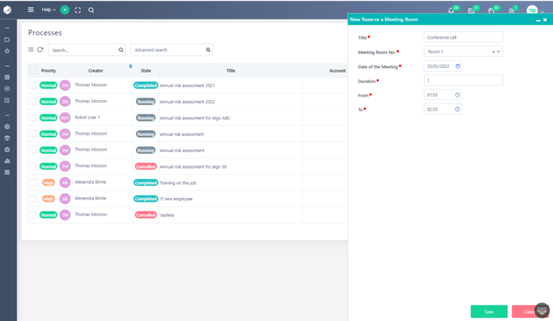 Employees can start the Application easily by clicking on the Quick-Add icon and then on Reserve a Meeting Room. In the pop-up window that appears users should fill in all mandatory fields for their booking request. By clicking on Save, the new entry is created in the Meeting Room Booking table.