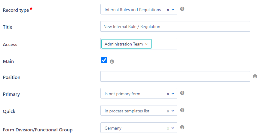 Members of the administration can start the Application easily by clicking on the Quick-Add icon and then on New Internal Rule / Regulation. The form that needs to be filled with the information about the new rule or regulation opens and they are able to submit data in the mandatory fields. By clicking on Save, the new entry is created in the Internal Rules and Regulations table.