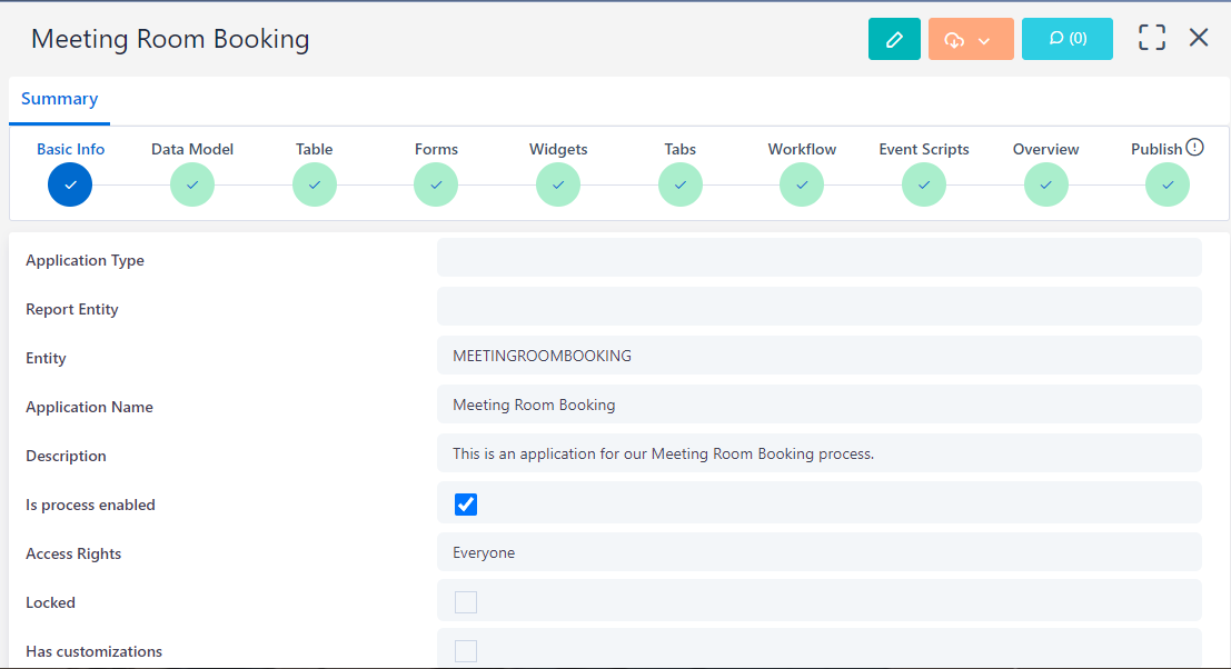 For this kind of application setup, we do not need a workflow. This business problem requires only a user to insert data without any tasks being connected. For this reason in the Basic Info step, In the field “Is process enabled” that defines if the Application would be connected to workflow, we keep the checkbox unticked. In the Access Rights field, we selected Everyone, since we want all users to have access in this App.
