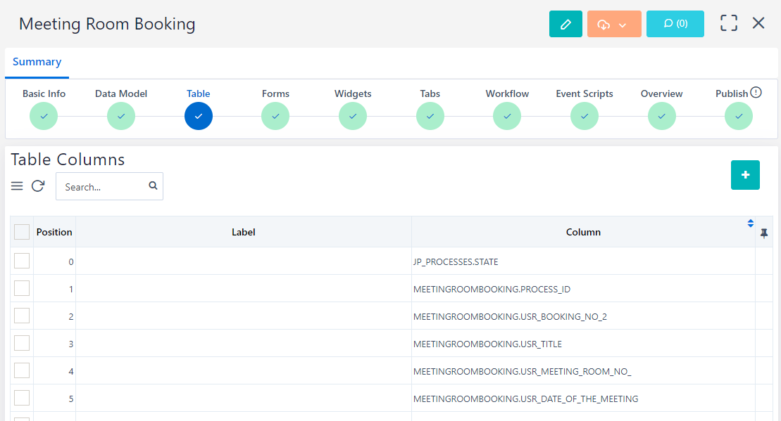 By drag-n-drop, we are going to organize the table columns of our Application. We are going to place the State of the request first, followed by the Booking Number and the reason for booking the meeting room. The State column is going to depict the Approval request status: Completed, Canceled or Pending.