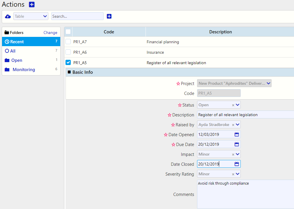 - Later on, on this Project, you may want to add the Date Closed, Reason Closed, Next Review Date or add some Mitigation/Comments.