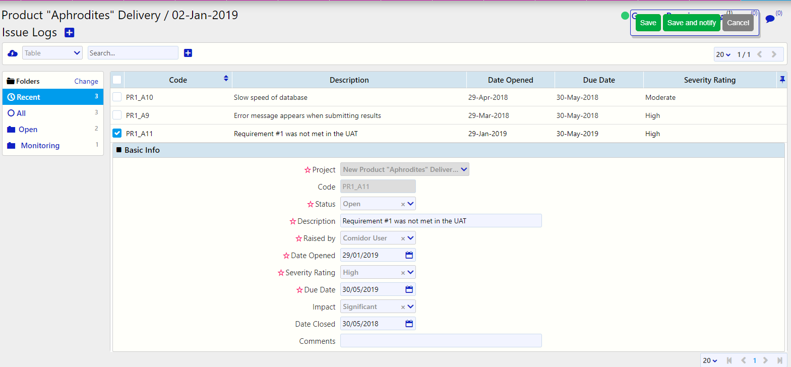 - To edit an Issue Log, click on it from the list of Issue Log entities and press the pencil button. Adjust the information you wish and then press Save to save the Issue Log changes. Choosing Save and Notify, Issue Log will be saved and you could send Note-Notification upon its edit not only to users but also to external recipients via email. Alternatively, click Cancel to cancel the procedure.