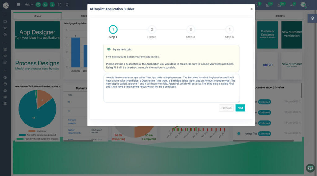 Experience the revolutionary AI Copilot Application Builder feature, introduced in Comidor v6.3, designed to transform the way users develop applications with the assistance of AI, achieving unparalleled levels of automation. The AI Copilot takes charge and creates your desired app simply by conversing with you through a few steps. Harness the power of Artificial Intelligence to expedite the development process, ensuring the creation of robust, reliable, and efficient applications with unparalleled precision and speed.