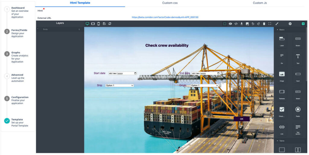 Say goodbye to complex coding and embrace the simplicity of Comidor’s portal app creation through a user-friendly, visual user interface that revolutionizes how businesses build dynamic and personalized portals. By leveraging the intuitive drag-and-drop functionality, businesses can choose from a vast array of components, such as text, labels, images, links, buttons, tables, grids, and more, to customize their portal apps to align with their unique brand identity and user requirements.